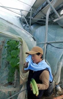100년만의 3월폭설로 충남 공주시 우성면 옥성리 비닐하우스가 쑥대밭이 되자 한 농민이 출하를 앞둔 오이를들고 망연자실한 표정을 짓고있다. 서울신문 포토라이브러리 |