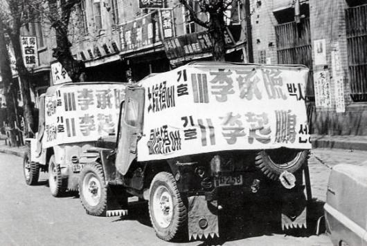 1956년 제3대 정·부통령 선거를 앞두고 자유당의 이승만 대통령후보와 이기붕 부통령후보의 유세용 지프들이 홍보용 플래카드를 붙인 채 길거리에 주차해 있다.당시에는 문맹률이 높아 후보의 기호를 숫자 대신 막대기 모양으로 표시했다.