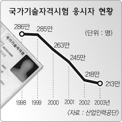 공단 검정계획부 관계자는 “일례로 실업계 고등학교의 재학생 수가 크게 감소했다.10년 전만 해도 한 반에 40∼50명씩 되던 학생 수가 이제는 20∼30명으로 크게 줄었다.”면서 “실업계 고등학교뿐만 아니라 요새는 대학도 이공계를 기피해 기술자격증은 더더욱 관심권에서 멀어지고 있다.”고 설명했다.