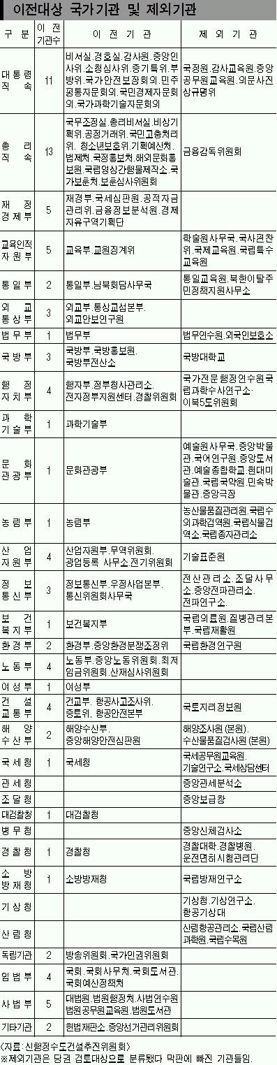 행정·입법·사법부의 모든 행정기관의 이전을 원칙으로 했다.이전 대상 선정은 정부기관 254개와 헌법기관 15개 등 모두 269개를 대상으로 이뤄졌다.정부기관으로는 대통령·국무총리 직속기관을 비롯해 중앙부처 및 독립기관 254개가 이전 검토 대상에 올랐다.이미 대전청사로 이전했거나 수도권밖에 있는 특별행정기관 107개는 이전 효과가 떨어진다는 점을 들어 실제 이전 검토 대상에서 빼고 진행됐다.조달청을 비롯한 대전청사 입주기관과 지방 국세청 등은 그대로 남게 된다는 얘기다.따라서 순수 이전 검토 대상은 132개 기관이며,이 가운데 58개 기관을 뺀 74개가 이전하는 셈이다.국정원·금감위·중앙공무원교육원 등을 빼고는 사실상 모든 기관이 이전한다고 보면 된다.