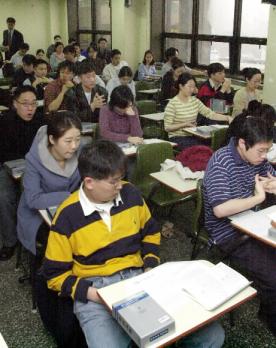 | 올해 외무고시 2차시험 합격자 발표 결과 지난해에 비해 합격선은 오르고 합격자들의 나이는 낮아진 것으로 나타났다.사진은 지난해 4월 서울 충정로 경기대에서 외무고시 2차 시험을 치르고 있는 수험생들.