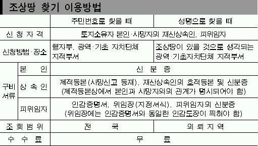 조회를 원하는 사람은 사망자의 제적·호적등본 등 신청자와 사망자의 관계를 알 수 있는 서류와 신분증을 가지고 광역·기초자치단체 지적과(또는 지적관리과)에 신청하면 된다.사망자 주민등록번호를 모르거나 이름만으로 조회할 땐 토지가 있을 것으로 추정되는 곳의 자치단체에 신청해야 한다.