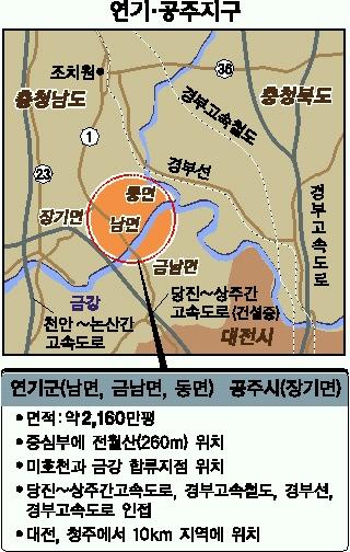 충남 연기군 남면·금남면·동면과 공주시 장기면 일대로 2160만평 규모다.국가중심점에 가깝고 접근성은 물론 풍수지리학적으로도 입지가 빼어나다는 평가를 받고 있다.원사봉(해발 254m)과 전월산(260m)을 중심으로 낮은 구릉지와 평야지대로 이뤄졌고 앞으로는 금강이 흐르는 배산임수형이다.