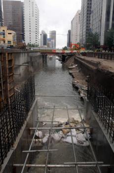 청계천에 흐를 물을 끌어오기 위한 하수관공사는 일부 교량 건설구간만 남긴 채 99%의 공정률을 보이고 있다.청계천의 새로운 물길이 될 저수로공사는 지난 3월부터 추진돼 절반쯤 진행된 상태다.장마철 동안 일시중단된 뒤 9월부터 본격화돼 내년 초쯤 마무리될 전망이다.