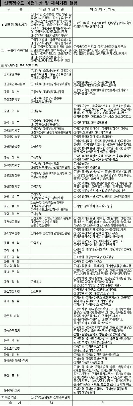 일단 이전 기관 대상을 행정부로만 국한해 순수한 ‘행정수도’로 추진하면서 천도 반대논리에 힘을 빼자는 뜻을 담고 있다.정부를 구성하는 중추 행정 기관 가운데 입법·사법부를 우선 이전 대상 기관에서 빼면 야당이 주장하는 천도 비판은 피할 수 있을 것으로 보인다.