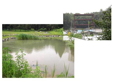 | 생물의 다양성이 풍부해 지난 2000년 서울시… 생물의 다양성이 풍부해 지난 2000년 서울시 생태계보전지역으로 지정된 강동구 둔촌동 습지(아래)와 이 습지 부근에서 공사 중인 신축 건물(위). 강동송파 환경운동연합 제공 |