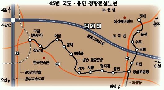 45번 국도는 남양주∼광주∼용인∼안성∼평택을 지나면서 경기 내륙을 잇는 도로다.이중 용인 시내 마평동∼평택을 잇는 도로가 4차선으로 새로 건설된다.연말 준공을 목표로 공사가 한창 진행 중이다.용인∼안성시 양성면 장서리까지는 올 추석 때 임시 개통할 예정이다.