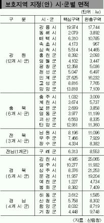 보호구역 가운데 생태·물리적으로 보호가 필요한 핵심구역은 45.2%인 24만 2000여㏊이고,핵심구역 보호를 위한 완충구역은 29만 3000여㏊다.당초 핵심구역은 백두대간 능선으로부터 300m 이내,완충구역은 700m 이내 지역으로 정할 계획이었으나 획일적이라는 지적이 많아 백지화하기로 했다.