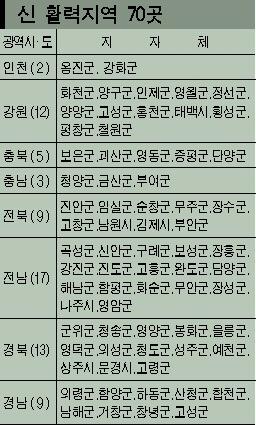 행정자치부는 23일 이같은 내용으로 ‘신활력지역’ 70개 시·군을 확정,발표했다.