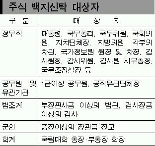 일정가액(3000만∼1억원 사이에서 검토 중) 이상의 주식을 보유하면 신탁을 해야 하며,구체적인 금액은 시행령에 담을 예정이다.