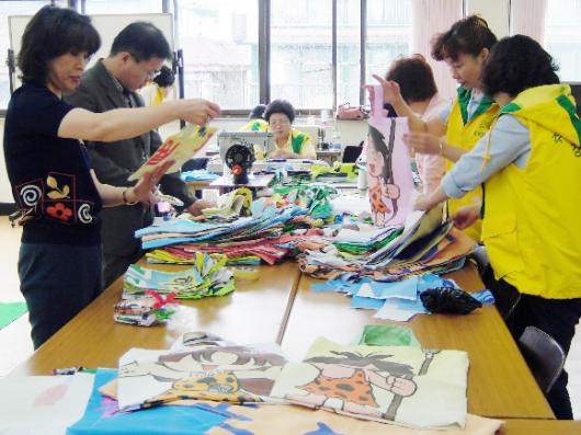 하루 생산량은 50여개다.한 명의 회원이 한 개 만드는 데 10분 정도 걸린다.직장에 다니며 짬을 내 일손을 돕는 금여경(50) 회원은 공업용 재봉틀을 제대로 다루고 손놀림이 빨라 30분에 70개를 만들어내기도 한단다.재단과 디자인을 거쳐 예쁜 장바구니가 탄생한다.현수막의 갖가지 색깔과 그림,글꼴을 살리려고 애쓴다.