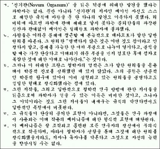베이컨과 데카르트에 관한 단락인 ‘ㄱ’과 ‘ㄴ’은 대등관계다.단락 ‘ㄷ’의 프랑스 철학자는 데카르트를 가리키므로 단락 ‘ㄴ’의 뒤에 이어진다.단락 ‘ㅂ’의 ‘이 메커니즘’은 단락 ‘ㅁ’의 후반에 진술된 ‘메커니즘’에 관한 계속된 설명이므로 단락 ‘ㅁ’ 다음에 단락 ‘ㅂ’이 이어진다.단락 ‘ㅁ’의 ‘그 규칙들이 단순히 공허한 표현’은 ‘베이컨과 데카르트의 규칙’을 뜻한다.
