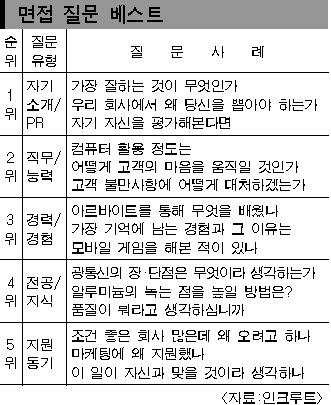 다음으로는 ▲컴퓨터 활용능력 등 직무능력을 묻는 질문이 13.1%(298건) ▲해외연수 등의 경험이나 경력을 묻는 질문이 7.6%(174건) ▲전공지식에 대한 질문이 7.1%(161건) ▲지원동기를 묻는 질문이 6.8%(155건)였다.그밖에 ▲회사나 직무에 대한 관심과 열정(143건,6.3%) ▲포부와 각오(142건,6.2%) ▲인성·적성(124건,5.4%) 등 지원자의 인성이나 자세를 평가하는 질문도 비교적 높은 비중을 차지했다.