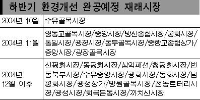 14일 강북구 수유골목시장을 시작으로 오는 11월까지 종로구 광장시장,중구 방산시장,중랑구 동부골목시장 등 약 10개의 시장이 환경개선사업을 마치고 준공식을 치를 계획이다.또 12월에도 동대문 청평화시장,강북구 번동북부시장 등 환경개선사업을 진행 중인 15개의 시장 중 일부가 재개장할 예정이다.<표 참조>