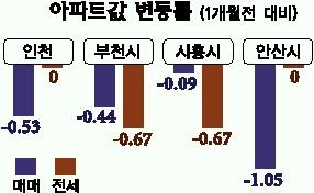부천시는 매매 가격이 0.44%, 전셋값도 0.67% 동반 하락하고 있다. 시흥시는 매매 가격 하락은 미미하지만 전셋값은 0.67% 하락해 비교적 큰 폭으로 떨어졌다. 안산시 아파트값도 하락폭이 크며 고잔신도시 푸르지오 아파트 30평형대는 2000만원 정도 내렸다. 경매물건도 급증하는 추세다.