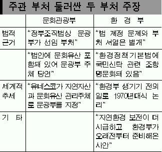 그러나 정부내 불협화음으로 이 법안은 여태껏 입법예고 절차조차 밟지 못하고 있다. 문화관광부가 “법 제정 주관부처는 환경부가 아닌 문광부가 돼야 한다.”며 국무조정실에 조정회의까지 신청하는 등 제동을 걸고 나섰기 때문이다. 주관부처 이관요구의 취지는 간단하다.▲법안 내용에 자연자산뿐만 아니라 문화유산이 포함돼 있고 ▲정부조직법상 문광부가 선임부처라는 이유다. 유엔교육과학문화기구(UNESCO)가 문화유산과 자연자산의 관리주체를 문광부로 지정하고 있다는 이유도 댔다.