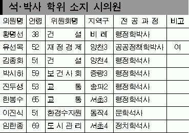 서울시의회(의장 임동규)가 1일 의원들의 연구활동 경향을 조사한 결과 무려 22명이 각 대학의 석·박사학위과정을 이수 중에 있는 것으로 나타났다. 또 현재 석·박사 학위를 가진 시의원도 8명이나 되는 것으로 밝혀졌다. 특히 현재 박사학위과정에 있는 의원은 무려 10명에 달해 후반기의회가 끝날 때쯤 서울시의회에 최대 12명의 박사의원이 활동하게 될 전망이다(표).