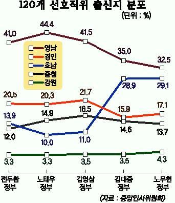 중앙인사위원회가 참여정부 출범 직후인 지난해 6월 발표한 30개 부처 실·국장급 120개 선호요직에 진출한 1∼3급 공무원의 정권별 출신지 분포를 보면 이같은 문제가 확연히 드러난다. 선호 요직에 대한 영남출신의 비율은 전두환 정부 때 41.0%, 노태우 정부 44.4%, 김영삼 정부 41.3% 등 높은 수치를 보였으나 김대중 정부 때는 35%, 노무현 정부에서는 32.5%로 떨어졌다. 반면 호남은 전두환 정부 13.9%, 노태우 정부 10%, 김영삼 정부 11.0% 등이었다가 김대중 정부 들어서면서 28.9%, 노무현 정부에서는 29.1%로 증가했다.