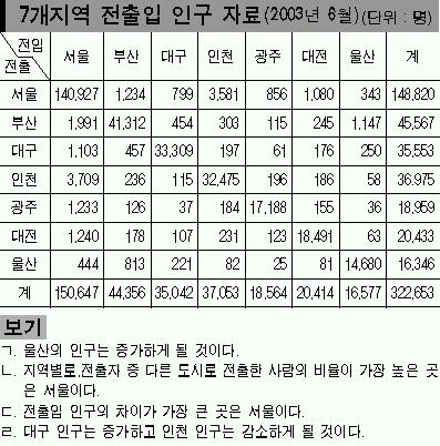 다음은 2003년 6월의 7개 지역 전출입 인구(동일지역 내 전출입 포함)를 조사한 표이다.(예를 들면 서울에서 전출하여 부산으로 전입한 인구는 1234명이다). 표와 같은 수치가 매달 유지된다고 가정할 때, 표에 근거하여 제시한 보기 중 옳은 설명을 모두 고른 것은?