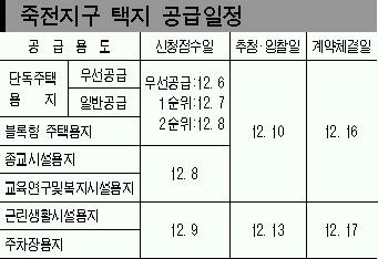 한국토지공사는 용인 죽전지구에 조성 중인 토지 53필지,7858평을 경쟁입찰 및 추첨방식으로 공급한다. 공급 대상 토지는 ▲단독 주택지 43필지 4442평▲블록형 주택용지 1필지 1294평▲종교시설용지 1필지 329평▲교육연구 및 복지시설용지 2필지 321평▲근린생활시설용지 4필지 672평 ▲주차장용지 2필지 800평이다. 근생시설·주차장시설용지는 경쟁입찰 방식으로 공급하고 나머지는 추첨식으로 청약자를 결정한다. 단독택지는 모두 주거전용택지로서 필지당 면적은 100평 정도이며 공급 예정가는 평당 284만∼364만원 수준이다. 블록형 주택용지 평당 267만원, 종교시설용지 388만원, 교육연구 및 복지시설용지 373만∼376만원, 근린생활시설용지 471만∼554만원, 주차장용지 381만∼409만원 등이다.