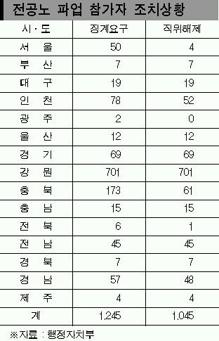 시·도별 징계요구 대상자를 살펴 보면 강원이 701명으로 가장 많고, 충북 173명, 인천 78명, 경기 69명, 서울 50명, 전남 45명 등의 순이다. 울산은 파업 참가자가 1151명에 이르지만 소속 자치단체장들이 아직 징계요구를 하지 않은 상황이다. 직위해제된 공무원은 대부분 파면 또는 해임될 것으로 보인다.