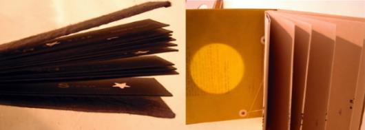 | 작품명 ‘무제’. 글자가 책장의 한 가운데… 작품명 ‘무제’. 글자가 책장의 한 가운데 새겨져 있으란 법은 없다. 책장이 접혀있는 모서리에 글자가 새겨져 있다. 실로 연결되어있는 책장을 펼치며 연결고리 역할을 하는 실을 타고 모서리에 새겨진 글자들과 소통하는 재미를 맛볼 수 있다. |