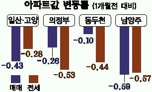 고양은 매매가 0.43%, 전세가는 0.28% 떨어졌다. 일산 신도시 30평형은 한달 사이 500만∼1000만원 정도 빠졌다. 파주는 매매가가 0.38% 떨어졌고 전세가도 많이 내렸다. 탄현면 유승아파트 32평형 전세가는 300만원 정도 내렸다.