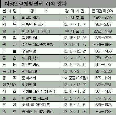 겨울학기를 맞아 서울시내 여성발전센터나 여성인력개발센터에서 다양한 취미생활을 반영한 이색 강좌가 넘쳐나고 있다. 크리스마스를 앞두고 산타 인형만들기, 파티음식 만들기 등 강좌도 잇달아 열리고 있다. 여성발전센터(womancenter.seoul.go.kr)는 서울시가, 여성인력개발센터(vocation.or.kr)는 여성부가 지원하는 곳으로 일반 문화센터에 비해 수강료가 절반 이상 싸다. 각 강좌는 선착순 등록이기 때문에 조기 마감될 수도 있다.