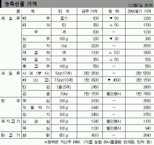 과일 가격은 배 값이 큰 폭으로 떨어졌을 뿐, 사과 등 다른 품목은 ‘제자리걸음’이었다. 배는 지난주보다 4600원이나 하락하며 2만원대 이하로 떨어진 1만 9900원을 기록했다. 지난해 같은 기간(3만 1500원)보다 무려 35%나 폭락했다. 사과는 전주와 같은 2만 2500원에 마감됐고 단감과 감귤은 기획행사 기간이어서 650원과 4400원 할인된 2450원,1만 1500원에 거래됐다.