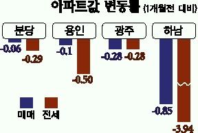 분당 아파트 값은 0.06% 떨어졌고 전셋값은 0.29% 내렸다. 구미동 20평형대 아파트는 500만원 정도 하락했다. 용인은 매매가 0.10%, 전셋값은 0.50% 내렸다. 상현동 성원아파트 32평형이 500만원 떨어졌다. 분당 구미동∼죽전간 길이 뚫리고 보정역이 개통되면서 용인 남부지역 교통사정이 크게 개선돼 죽전지구 아파트에 관심이 쏠린다.