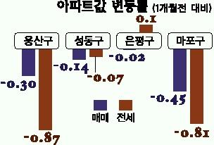 용산구는 매매가격이 0.30%, 전셋값은 0.87%떨어졌다. 동부 이촌동의 오래된 아파트는 리모델링사업 추진이 관심을 끈다. 성동구 매매가는 0.14%, 전세가는 0.07% 빠졌다. 행당동 한진타운 26평형 전셋값은 200만∼300만원 정도 하락했다.