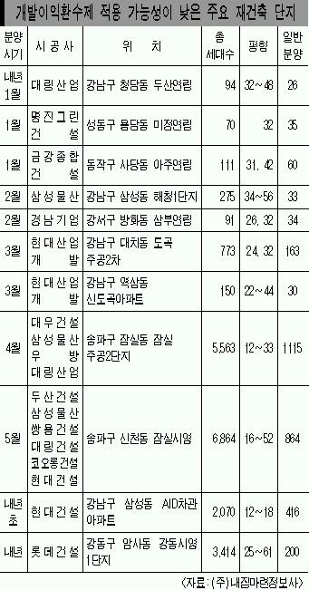 이에 따라 사업승인을 받은 단지들 가운데 사업추진이 비교적 빠른 일부 단지는 개발이익환수를 피해갈 수 있을 것으로 보인다. 대략 11개단지 2만여가구에 달할 것으로 보인다. 대부분 강남권 단지인 것도 특징이다.