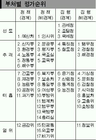 반면 금융감독위원회·민주평화통일자문회의·청소년보호위원회·외교통상부·비상기획위원회 등은 이제야 혁신활동을 시작해 최하위 판정을 받았다. 이들 5개 부처는 혁신에 대한 기초도 갖추지 못해 근본 틀부터 마련해야 한다는 것이 평가단의 진단이다. 건설교통부·보건복지부·재정경제부 등 25개 부처도 성과 미흡으로 불합격 판정을 받고 미흡그룹으로 분류됐다.