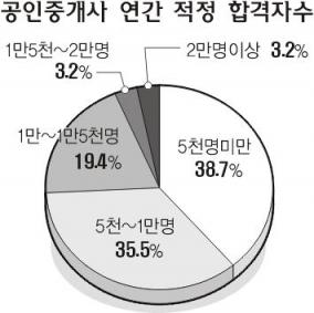 조사 결과에 따르면, 합격자가 매년 2만여명 가까이 배출되고 있는 현행 시험과 관련,62명의 교수 가운데 24명(38.7%)이 5000명 미만으로 조절해야 한다고 응답했다.5000명 이상 1만명 미만이 적당하다고 답한 응답자도 22명(35.5%)으로 1만명 미만이 적당하다는 응답이 전체 74.2%에 달했다.