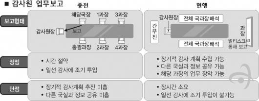 감사원 관계자는 “국·실장이 해당 업무를 총괄하지만 실제 감사의 성패는 과장에 달려 있다.”면서 “전체 국·실·과장이 모인 자리에서 업무보고를 하면 해당 과장의 업무파악도를 높일 뿐 아니라 과장의 능력도 평가할 수 있는 이점이 있다.”고 밝혔다.