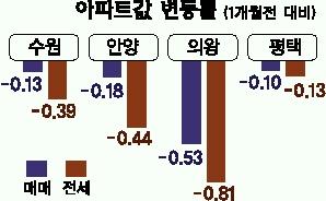 안양도 매매가 0.18% 빠져 지난 달보다 하락폭이 줄었다. 전세가는 0.44% 하락했다. 박달동 극동아파트 33평형이 500만원 안팎 내렸다. 의왕은 매매가 0.53%, 전세가는 0.81% 떨어져 하락폭이 크다. 오전동 신안아파트 30평형대가 1000만원 정도 내렸다.