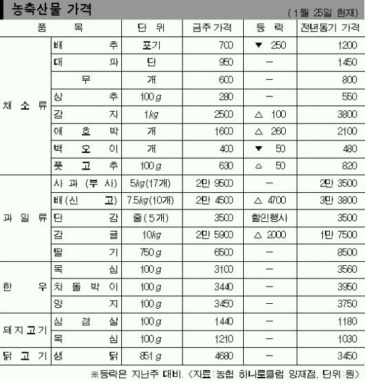 사과는 지난 주와 같은 보합세를 보이며 2만 9500원에 거래됐으나, 전년 같은 기간에 비해 6000원이 상승한 상태다. 다만 딸기는 지난주와 같은 6500원에 마감돼 전년 같은 기간보다 2000원이 떨어졌다. 신홍수 농협 하나로클럽 양재점 과일팀장은 “설대목이 가까워지면서 산지 출하량도 늘어나고 있으나, 설날 제수용 과일을 미리 준비하려는 현상이 일면서 과일값이 상승하고 있다.”며 “과일 가격은 설날 전후까지 강세를 보일 것”이라고 내다봤다.