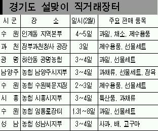 농협경기지역본부는 28일 설을 앞두고 제수용품과 한우 등 산지에서 바로 들어온 국산 농축산물을 저렴하게 판매하는 ‘설맞이 직거래 장터’를 개장한다고 밝혔다.