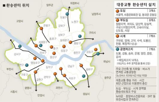환승센터가 들어서는 곳은 도심의 경우 서울역, 세종문화회관 앞, 동대문운동장 등 3곳, 부도심은 청량리역, 여의도, 당산역, 잠실역, 구로디지털단지역, 고속터미널, 신도림, 사당 등 8곳, 시계 지역은 구파발, 양재, 고덕, 수색, 도봉산, 천왕, 복정역 등 7곳이다. 도봉, 강동, 송파, 은평, 양천, 중랑, 강서 등 공영차고지 7곳도 환승센터로 이용된다.