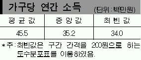 30가구로 구성된 어떤 마을의 가구당 연간 소득을 조사하여 마을의 연간 소득 수준을 설명하려 한다. 다음 자료는 가구당 연간 소득의 평균값, 중앙값, 최빈값이다.