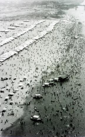 | 1967년 여름 광나루 유원지에서 시민들이 물… 1967년 여름 광나루 유원지에서 시민들이 물놀이를 하고 있다. 많은 인원이 몰려 사람들이 점으로 보인다. 모래밭에 늘어선 ‘천막 물결’이 이채롭다. ‘사진으로 본 강동구’에서 발췌 |