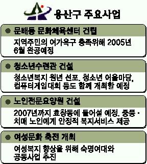 구는 우선 용산 청소년수련관을 건립할 계획이며 청소년 어울마당 축제 개최, 컴퓨터 게임대회 등 청소년이 관심을 가질 만한 사업들부터 추진할 방침이다. 또 숙명여대와 협력해 용산구 ‘건강가정지원센터’를 운영해 가정문제 상담, 가정생활 교육 등을 통해 건강한 가정생활을 도울 예정이다. 숙명여대와 공동으로 여성문화 축전을 7월에 개최할 예정이다.