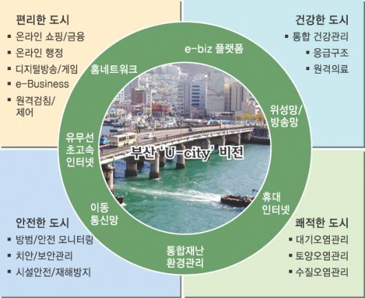 유비쿼터스 기술은 지금까지 일부 도시나 국가에서 가상적 체험공간 또는 특정분야에 적용한 사례는 있었지만 부산시처럼 항만과 교통, 산업, 관광, 컨벤션, 전자정부, 시민생활 등 도시 전체에 종합적으로 적용해 상용화하려는 시도는 ‘부산 U-시티’사업이 세계 최초다. 부산시에 따르면 ‘부산 U-시티’사업은 오는 2010년까지 1조원을 투자하는 대규모 프로젝트로 우리나라를 대표하는 정보통신업체인 KT를 비롯해 IBM, 휼렛패커드(HP), 마이크로소프트(MS) 등 세계적인 IT기업과 컨소시엄을 구성해 추진하며 재원도 세계적인 파이낸싱 회사 등을 통해 조달한다는 계획이다.