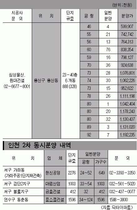 성수동에서는 태천종합건설이 28∼57평형 23가구를 내놓았다. 계약 이후 바로 입주 가능하다. 분양가는 평당 790만∼860만원.2호선 뚝섬역이 걸어서 3분 거리.6월 개장을 앞둔 서울숲이 가깝다. 성동구 홍익동에서는 대주건설이 27∼30평형 58가구를 일반분양한다. 입주는 2005년 10월 예정. 분양가는 평당 980만∼1140만원이다.
