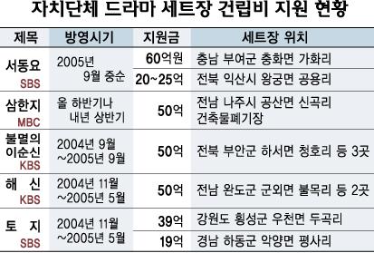 자치단체들은 표면적으로는 지역이미지 제고 및 지역경제활성화를 위해선 돈이 조금 들더라도 드라마 세트장 건립은 불가피하다며 투자로 봐줄 것을 주문한다.TV가 가진 막대한 전파력과 홍보효과를 염두에 둔 것이다. 이 때문에 드라마 유치전은 점점 치열해지고 비용도 올라가고 있다.