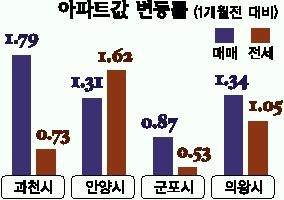 수원은 매매가는 0.27%, 전세가는 0.44% 올랐다. 천천동 성우아파트 40평형이 1000만원 정도 상승했다. 과천∼안양∼의왕으로 이어지는 지역 아파트값이 많이 올랐다. 과천은 매매가격이 1.79%, 전세가는 0.73% 올랐다. 주공10단지 27평형이 1500만원 안팎 올랐다. 안양지역은 매매가 1.31%, 전세가는 1.62% 상승률을 기록했다. 의왕은 매매가 1.34%, 전세가는 1.05%로 상승세를 이어갔다. 산동 한아름아파트 34평형이 1000만원 안팎 올랐다. 군포는 매매가 0.87%, 전세가 0.53% 상승했다. 평택은 매매가와 전세가가 지난달과 비슷한 수준에서 형성됐다. 판교와 동탄신도시를 중심으로 수도권 남부지역에 관심이 쏠리고 있다. 경부고속도로축 남부 주거벨트가 형성되면 주거환경과 교통여건 등이 개선될 것으로 기대되기 때문이다.