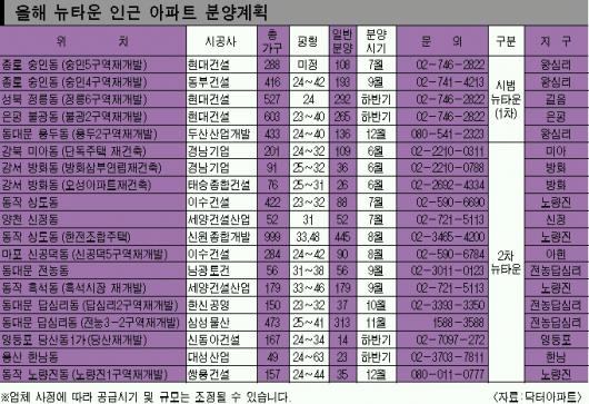 두산산업개발은 동대문구 용두동 74의1 일대 용두2구역 재개발사업을 통해 총 433가구 가운데 24∼40평형 136가구를 12월에 분양할 예정이다. 청계천 복원사업구간 인근에 위치한 단지로 왕십리뉴타운과는 걸어서 10여분 거리이다. 현대건설은 성북구 정릉동 252 일대 정릉6구역을 재개발해 527가구 가운데 24평형 292가구를 올 하반기 일반 분양한다.