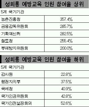 입법·사법·행정을 통틀어 국가기관 가운데 교육인원 참여율이 가장 낮은 곳은 감사원으로 22.8%에 불과했다. 행정자치부(37.5%)와 국세청(40.9%) 등은 50%에도 미치지 못했다. 특히 남녀차별 진정사건을 다루는 국가인권위원회는 42.8%에 불과했으며, 대검찰청과 청소년위원회도 각 59.8%,79.1%로 체면을 구겼다.