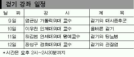 특히 서울시의사회의 협조로 전문의들이 과학적이고 체계적으로 걷기 운동에 대해 강의하게 된다.9일 가톨릭의대 염근상 교수의 ‘걷기와 대사증후군’ 강좌를 시작으로 ▲10일 인제대의대 이우천 교수의 ‘올바른 걷기’ ▲11일 연세대의대 허갑범 명예교수의 ‘걷기와 당뇨병’ ▲경희대의대 장성구 교수의 ‘걷기와 관절염’ 등이 준비돼 있다. 매일 만보계 1000개도 선착순으로 지급할 계획이다.