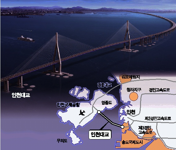 송도∼영종도간 12.3㎞(해상교량 11.7㎞)를 왕복 6차선으로 잇는 제2연륙교는 최대 교각 간격이 800m, 주탑 높이가 230m에 이르는 사장교로 2009년 10월 완공된다.